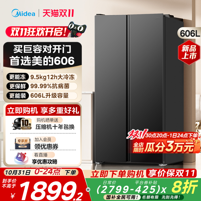 美的606对开双开门大容量冷冻超薄风冷无霜变频家用冰箱以旧换新