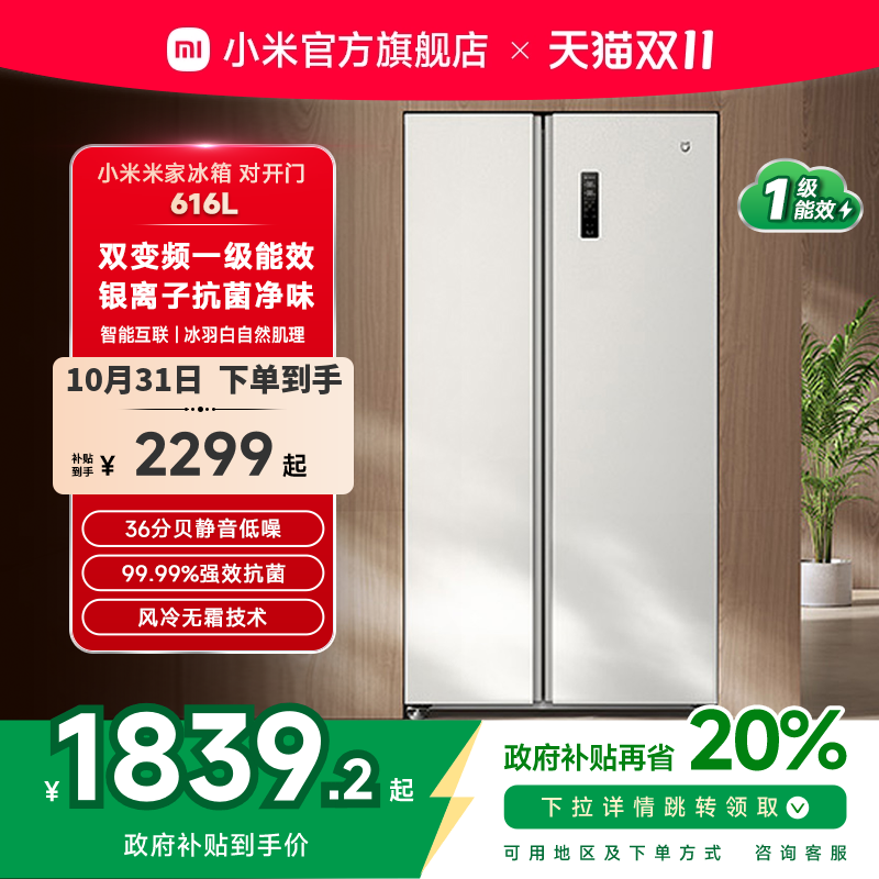 小米米家616L双开对开门风冷无霜变频一级智能大容量白色家用冰箱