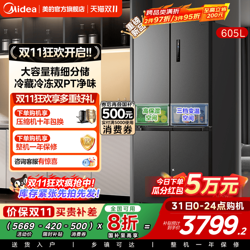 美的607L对开双开门大容量风冷无霜一级能效家用电冰箱官方旗舰店