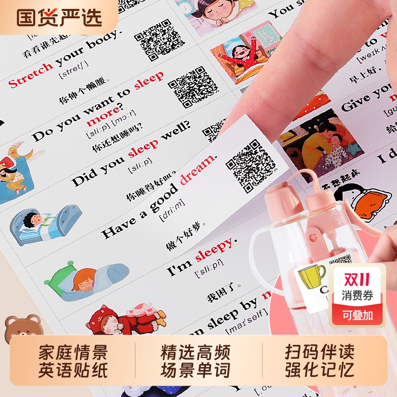 小学生家庭情景英语口语贴纸升级防水透明随处便利贴儿童启蒙英语单词励志短语短句日常生活学习贴纸扫码音频
