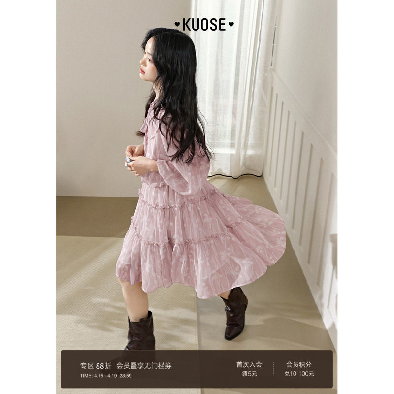 阔色粉色碎花裙长袖连衣裙26春季新款女法式收腰雪纺裙短裙子夏