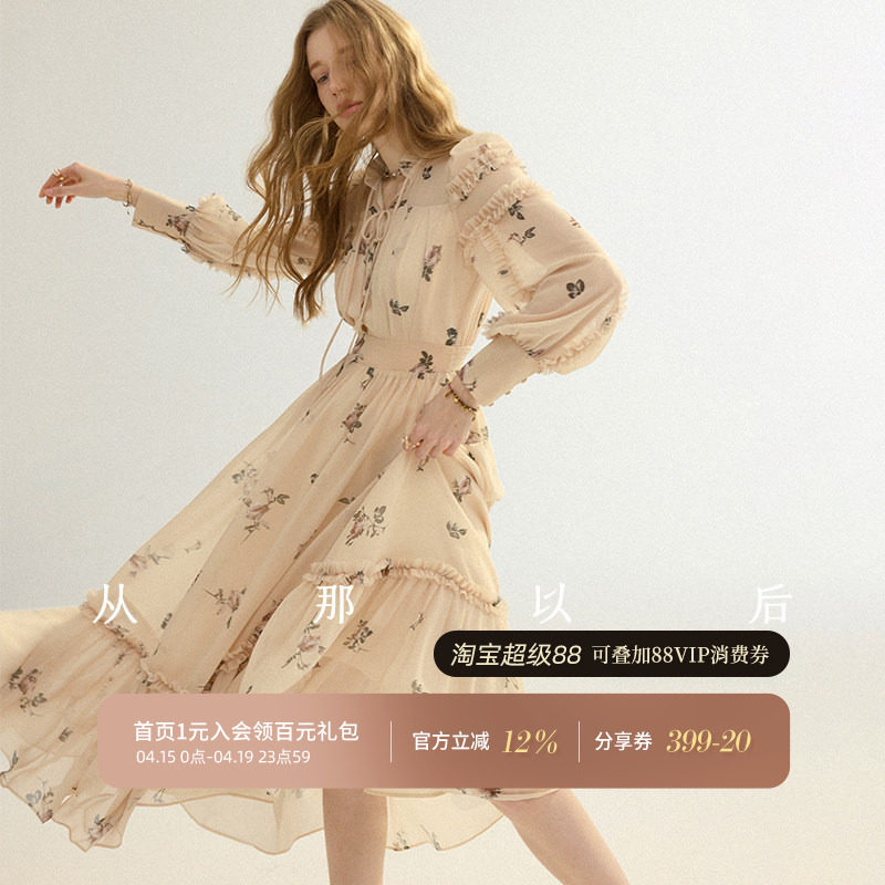 从那以后法式复古碎花裙雪纺连衣裙V领荷叶边长裙长袖裙子女春季