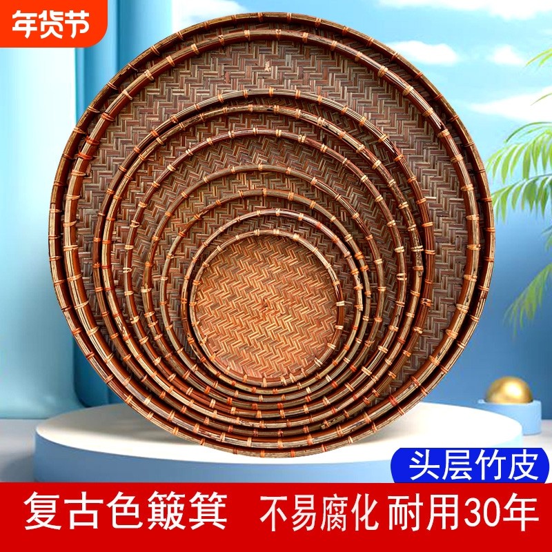 竹编簸箕平底圆形竹簸箕大号晾晒干货手工编织无孔竹筛子头层竹皮