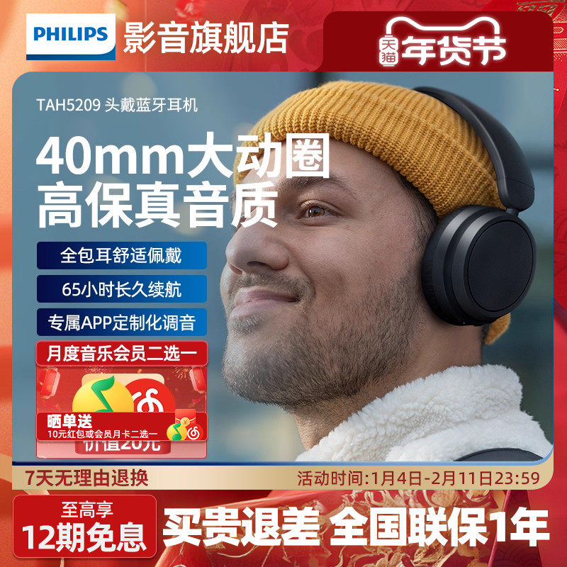 飞利浦TAH5209头戴式无线蓝牙耳机长续航高清通话降噪折叠护耳式