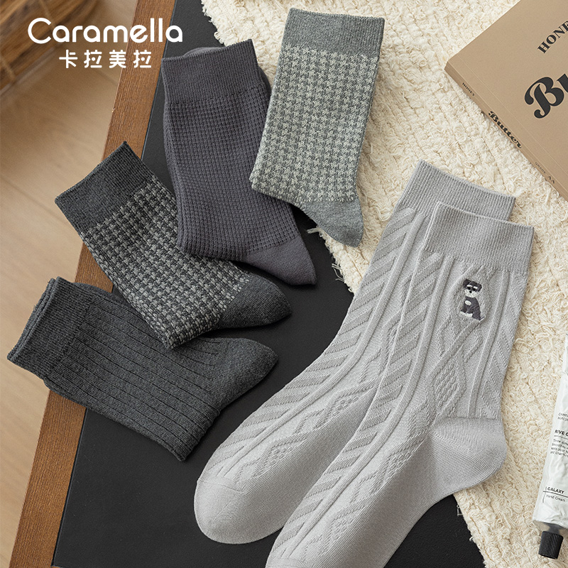 卡拉美拉2025秋冬新款男袜中筒袜刺绣双针男士百搭棉袜简约男袜