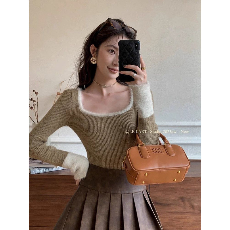 2025春秋新款拼色修身短款马海毛上衣毛衣小香赫本内搭显瘦针织衫