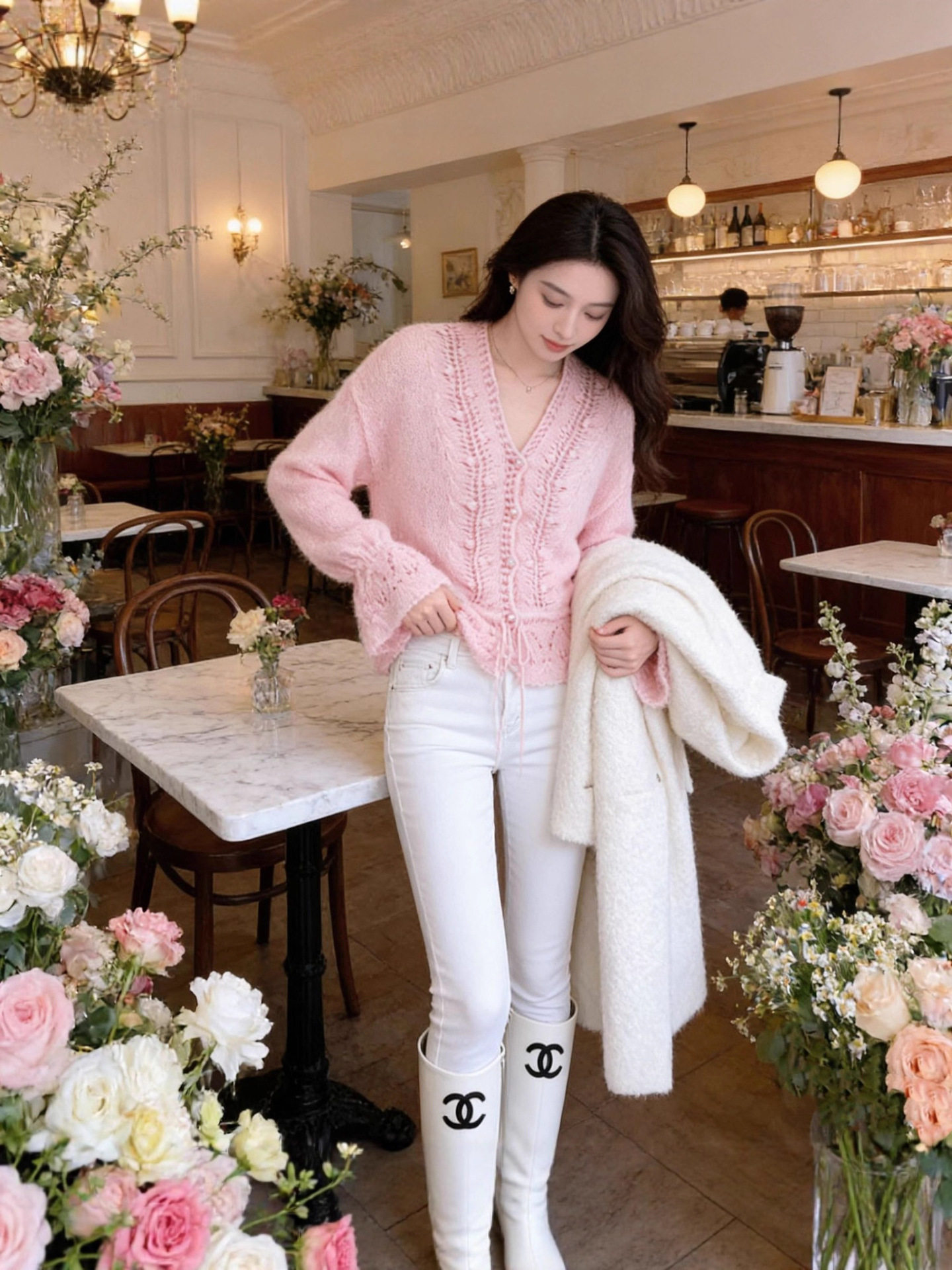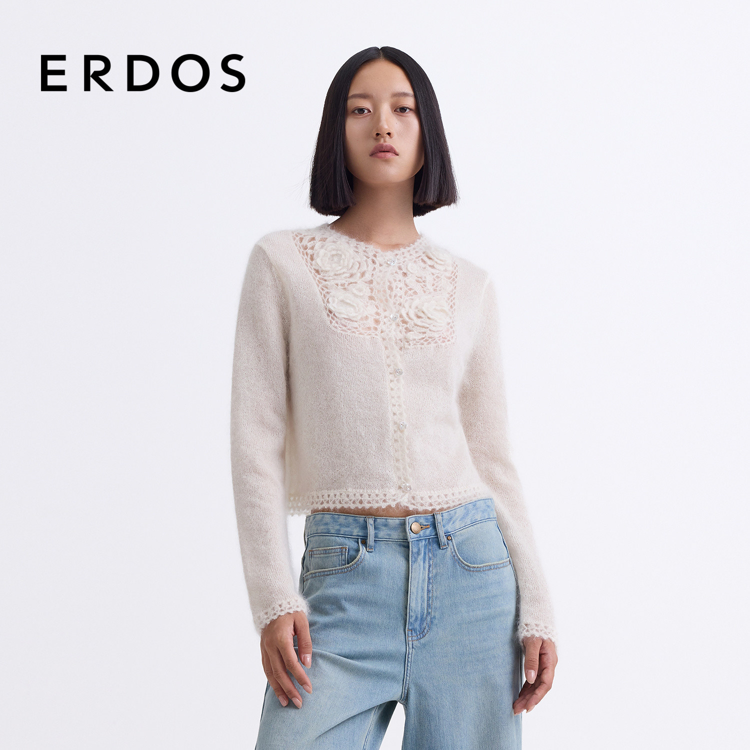 2025新款重工花朵撞色V领针织衫毛衣外套显瘦MIU系短款马海毛上衣