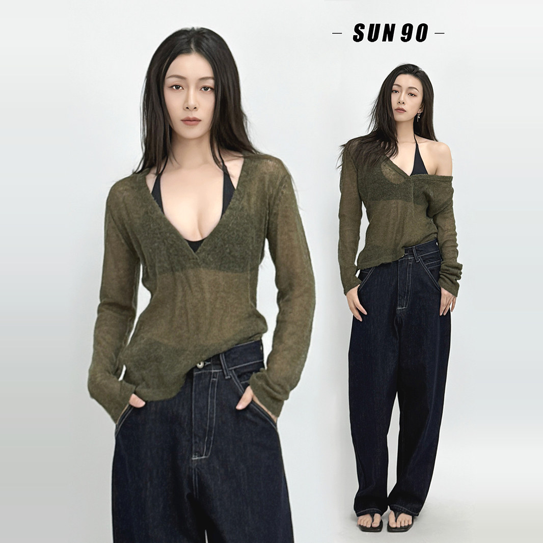 SUN90 雾感深V领长袖针织衫防晒罩衫女橄榄绿/咖色透视马海毛上衣