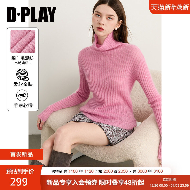 DPLAY2025年冬季新款粉色珠片修身高领针织衫含绵羊毛马海毛上衣