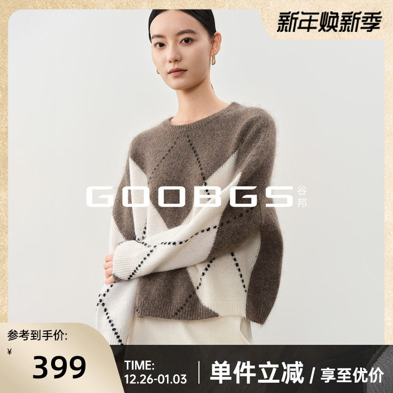 谷邦菱形格撞色毛针织衫女2025冬季新款气质宽松显瘦马海毛上衣