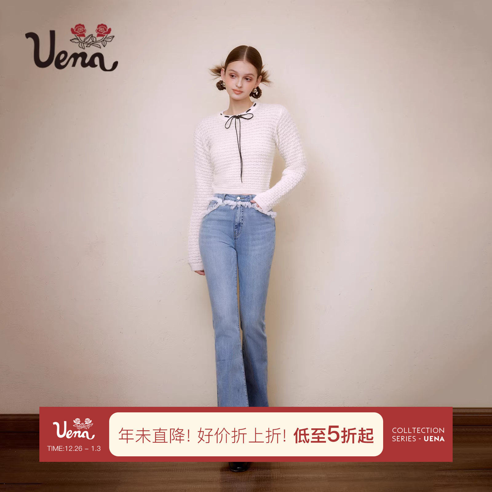 【白茶清欢】Uena米白色领边抽绳蝴蝶结毛针织衫圆领马海毛上衣女