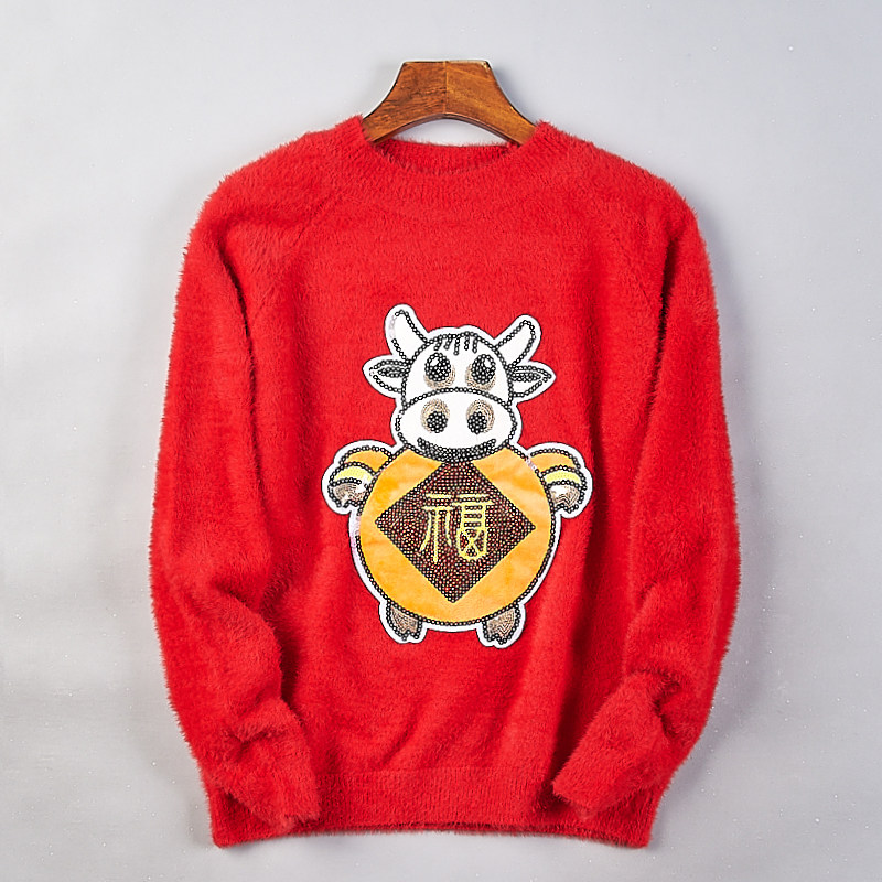 419本命年属牛大红色圆领针织衫女80532春秋冬生肖刺绣马海毛上衣