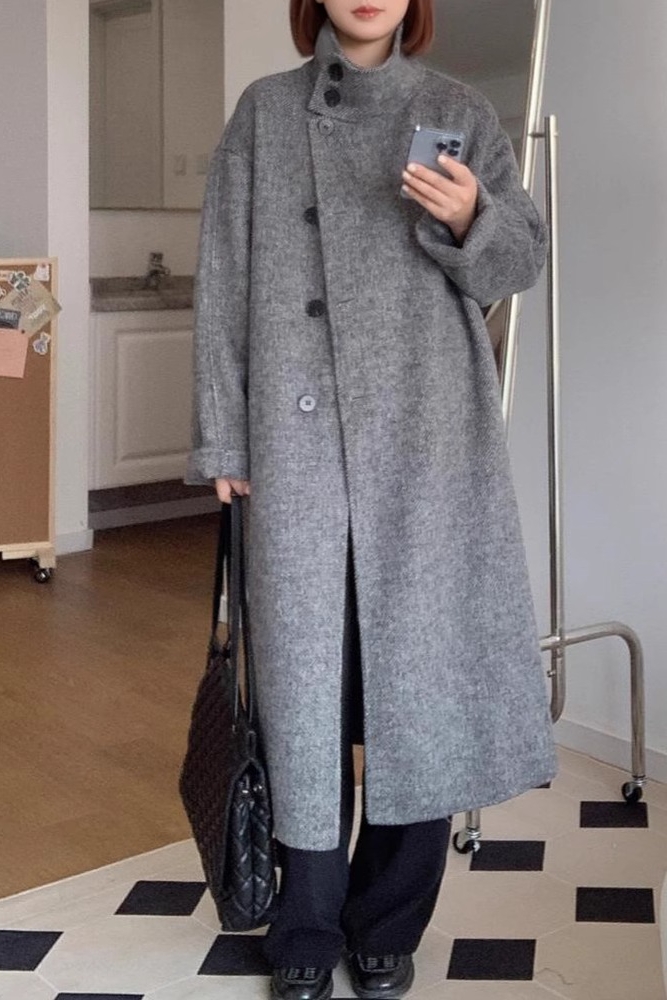 高级感复古灰色毛呢外套女冬季新款中长款小个子立领宽松呢子大衣