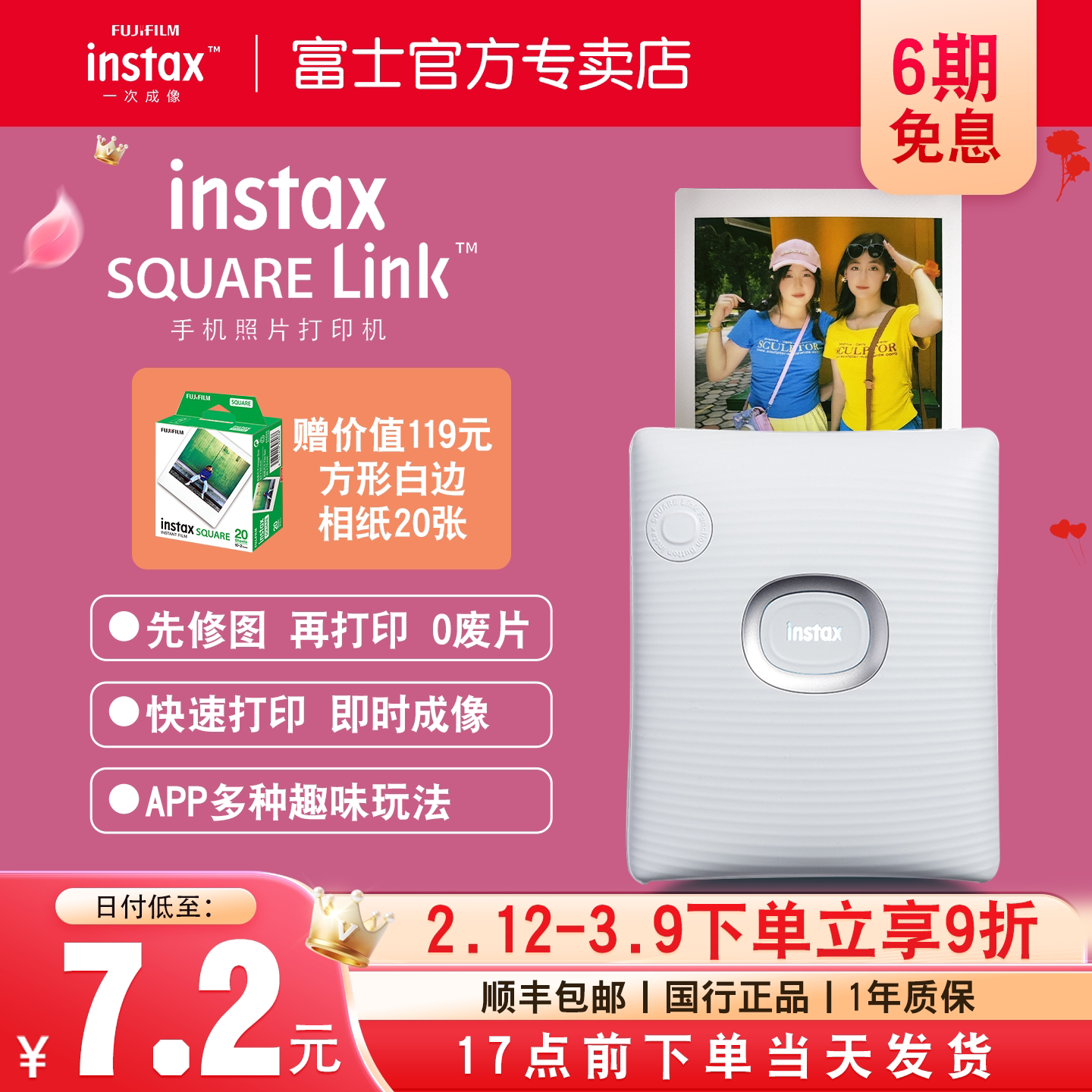 【6期免息】富士instax SQUARE Link一次成像便携式方形照片打印机蓝牙连接手机照片打印机礼物