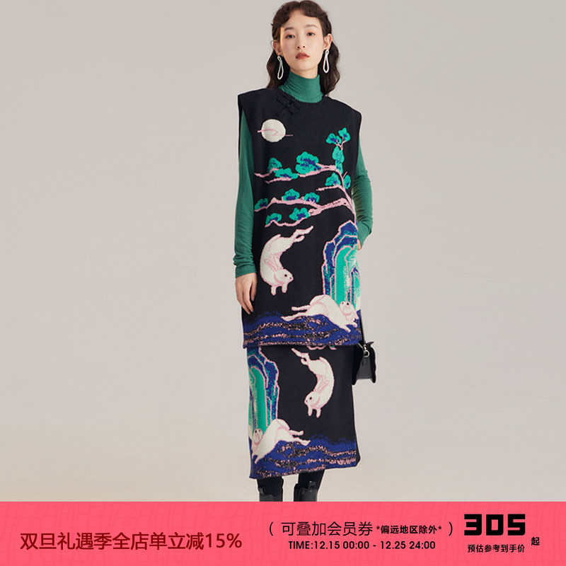 有耳uare原创设计师 月下兔 新中式国风针织背心马甲毛衣裙中长款