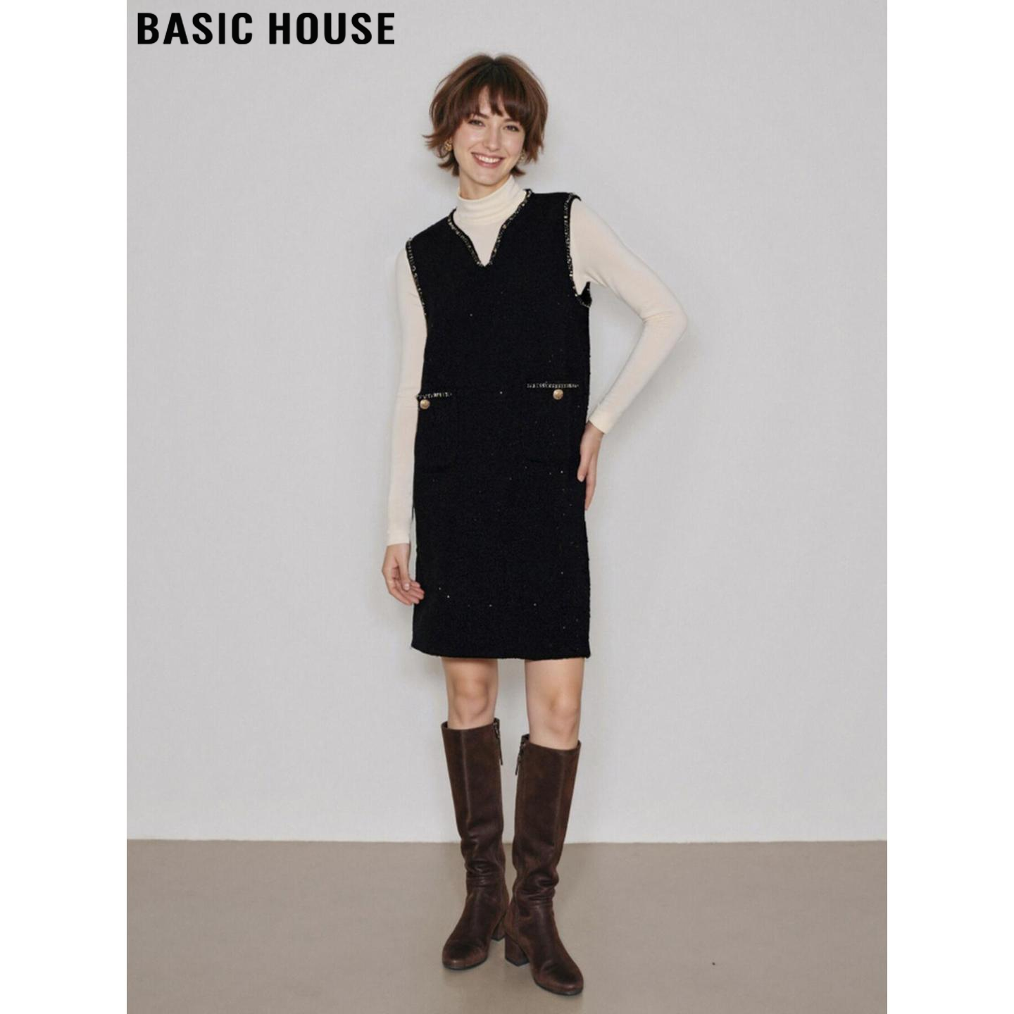 Basic House/百家好黑色V领羊毛针织背心裙女士春季中长款打底裙