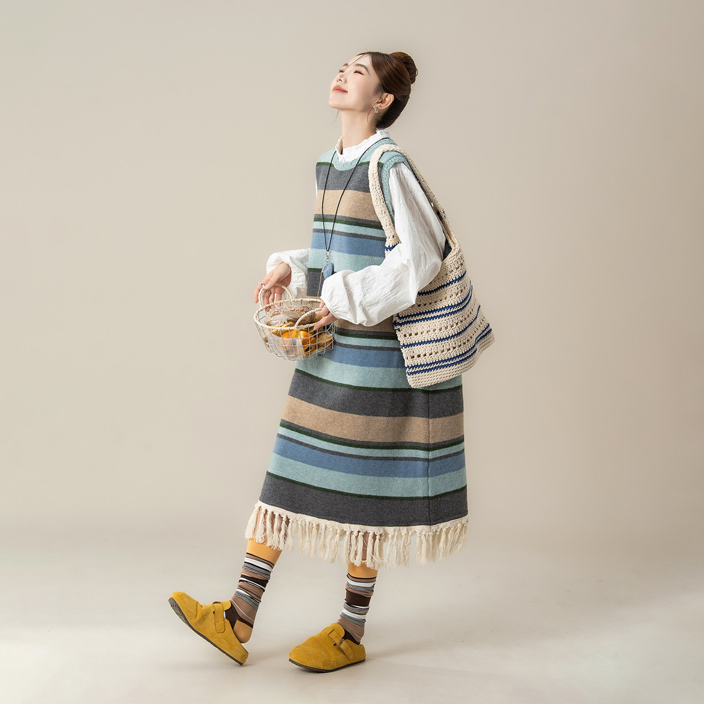 日系复古条纹撞色流苏拼接针织背心裙女春秋新款中长款宽松连衣裙
