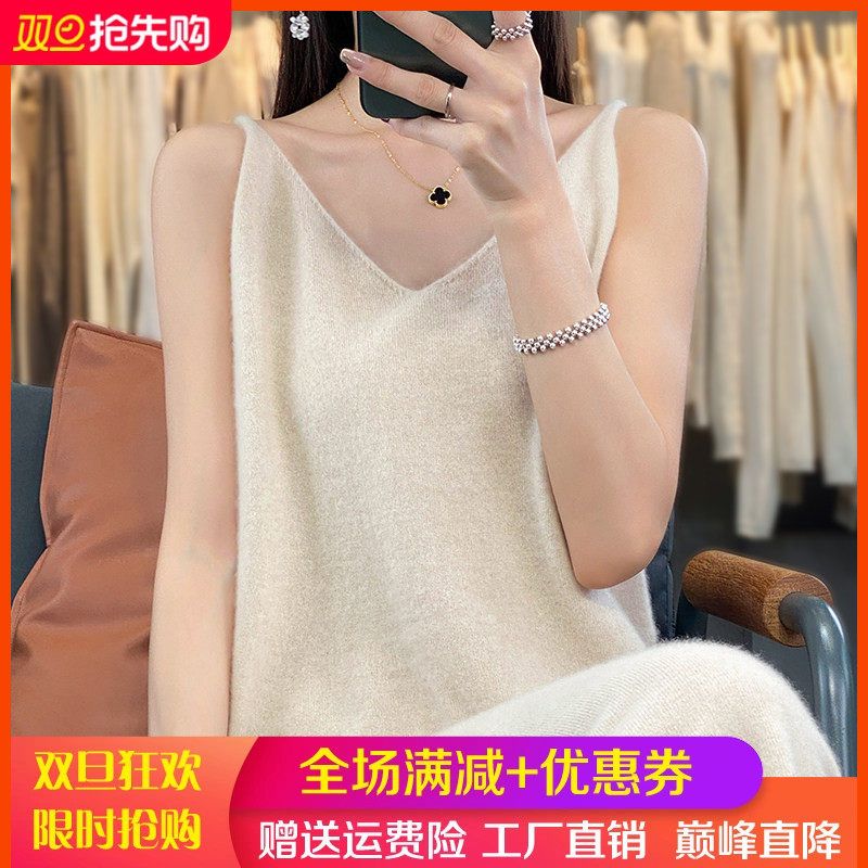 V领100%纯羊毛吊带女中长款针织无袖背心裙宽松羊绒连衣裙打底衫