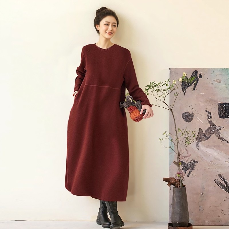 知笔墨安克拉红羊毛棉显瘦圆领连衣裙 2025春长袖针织打底裙子