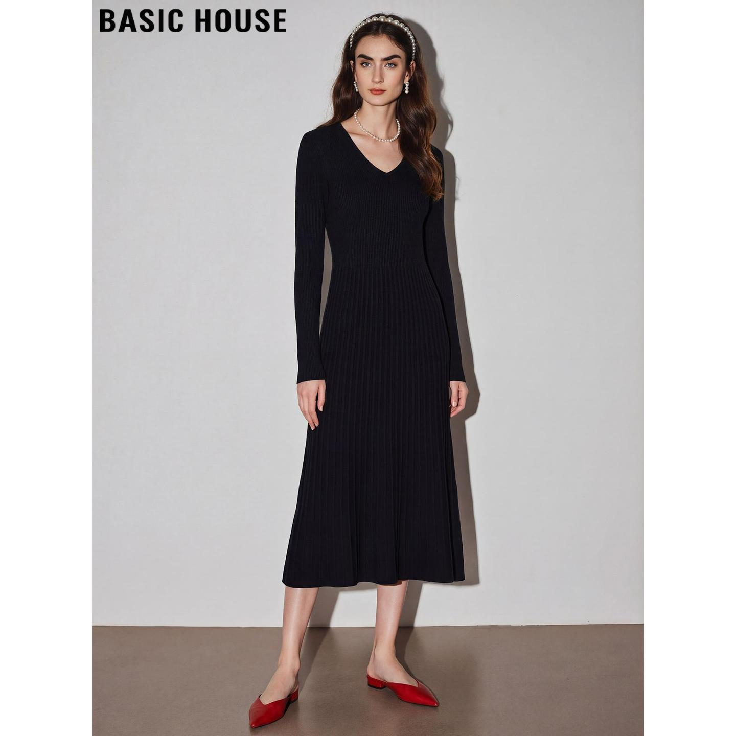 Basic House/百家好黑色V领连衣裙女2026春季新款收腰针织打底裙