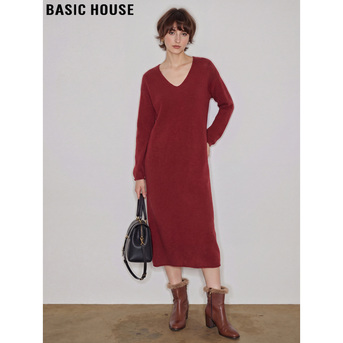 Basic House/百家好新年红羊毛连衣裙女士2026春季新款针织打底裙