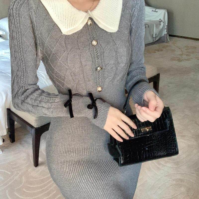 小香风法式甜辣针织打底裙女春秋新款设计感收腰显瘦娃娃领连衣裙
