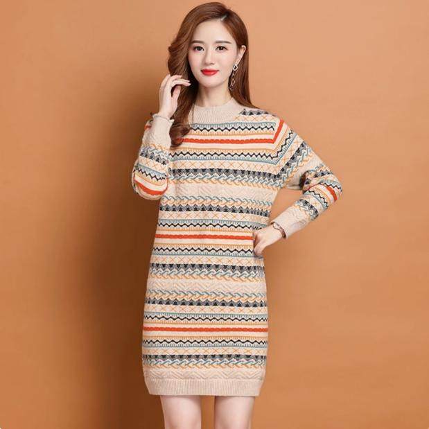 拼色毛衣裙女中长款秋冬季加绒加厚针织打底裙套头宽松百搭连衣裙