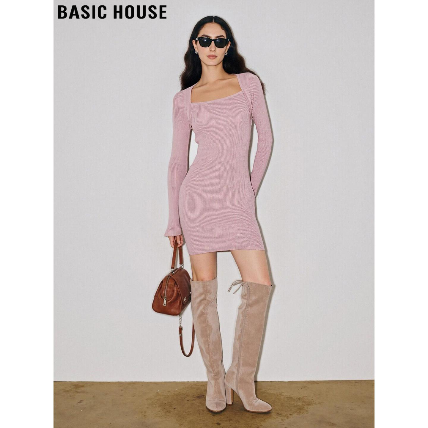 Basic House/百家好粉色方领针织打底裙女2026春季新款修身包臀裙