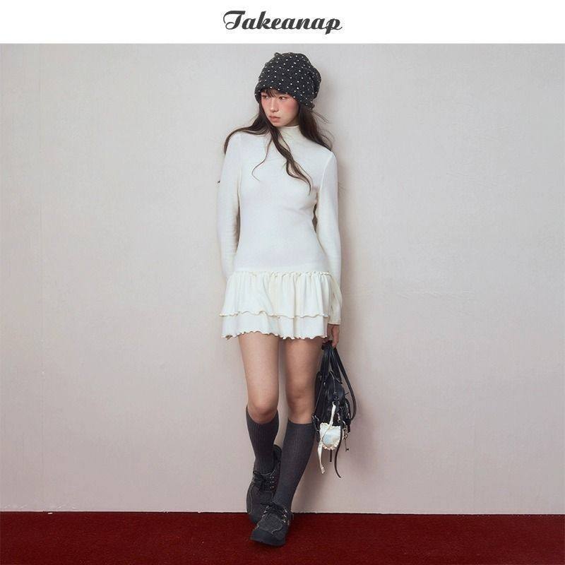 甜酷穿搭高领修身秋冬连衣裙女运动短裙收腰显瘦木耳边针织打底裙
