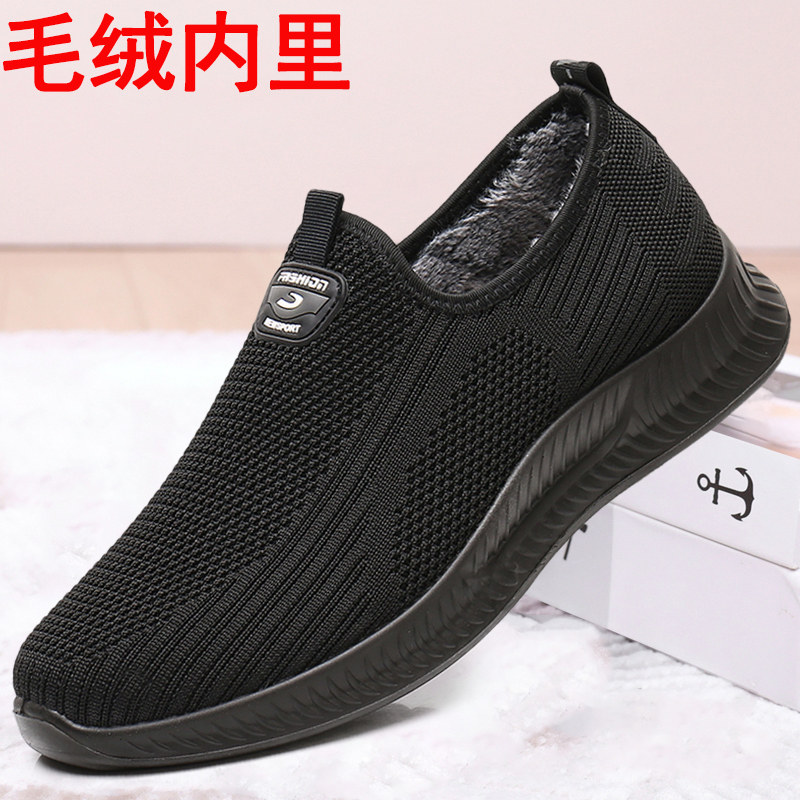 冬季保暖老北京布鞋男薄绒二棉鞋厚底防滑一脚蹬爸爸鞋中老年男鞋