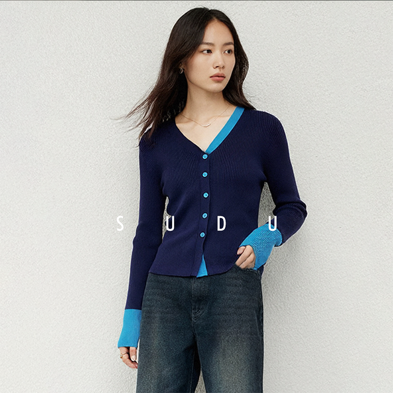 SUDU素都2026春季新款撞色拼接V领长袖针织衫女软糯修身开衫上衣