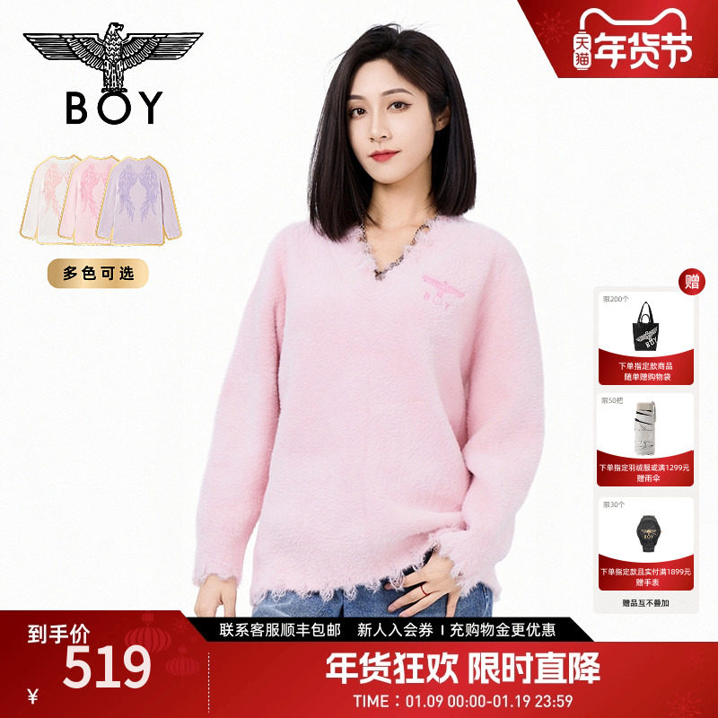 【柔雾天使】BOYLONDON春秋仿貂绒潮牌女款V领长袖针织毛衣W60902