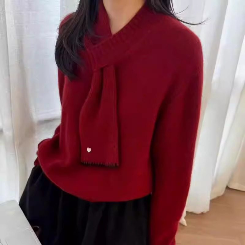 BADX正品撞色边桃心围巾V领长袖针织衫女冬季宽松慵懒风百搭毛衣