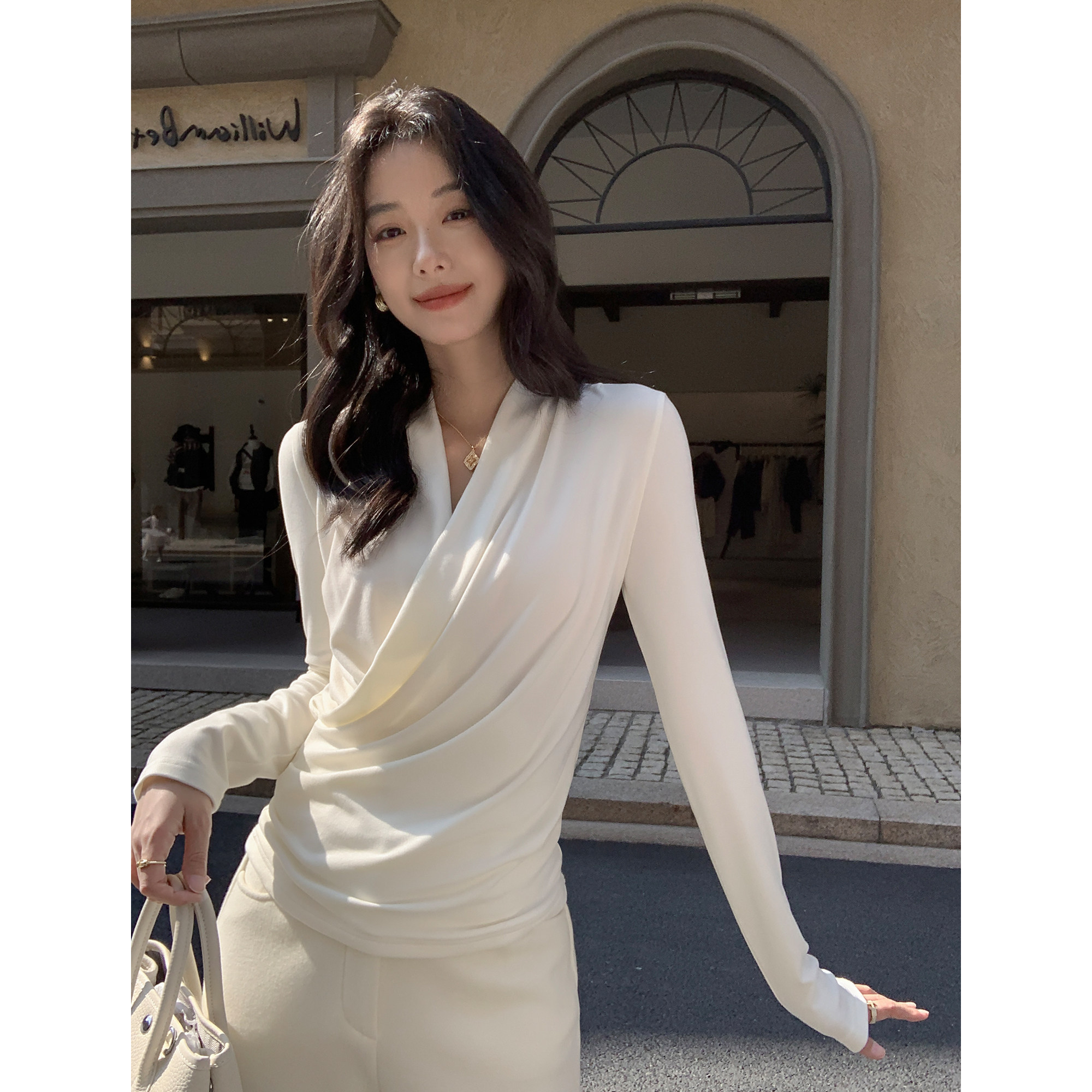 pusumede【现货6折】吸睛扭结 v领长袖针织t恤女修身气质内搭上衣
