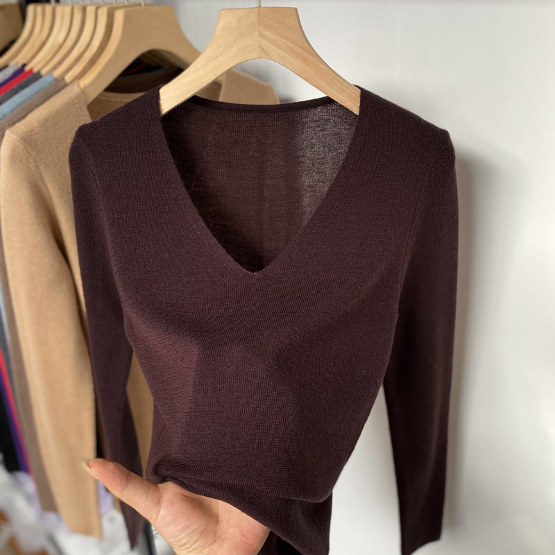 春秋冬V领长袖针织上衣100超细美丽诺纯羊毛薄款修身打底衫女内搭
