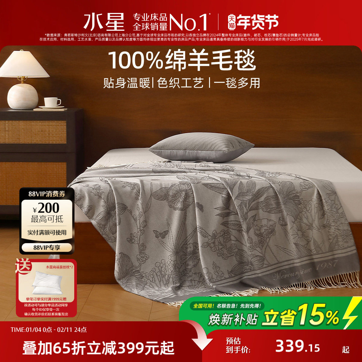 水星家纺羊毛毯100%绵羊毛保暖盖毯办公室午休毯子沙发毯空调毯