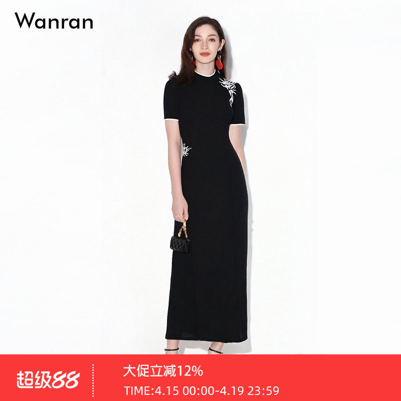 Wannathis性感风黑色丝绒连衣裙修身收腰开叉旗袍轻名媛气质长裙