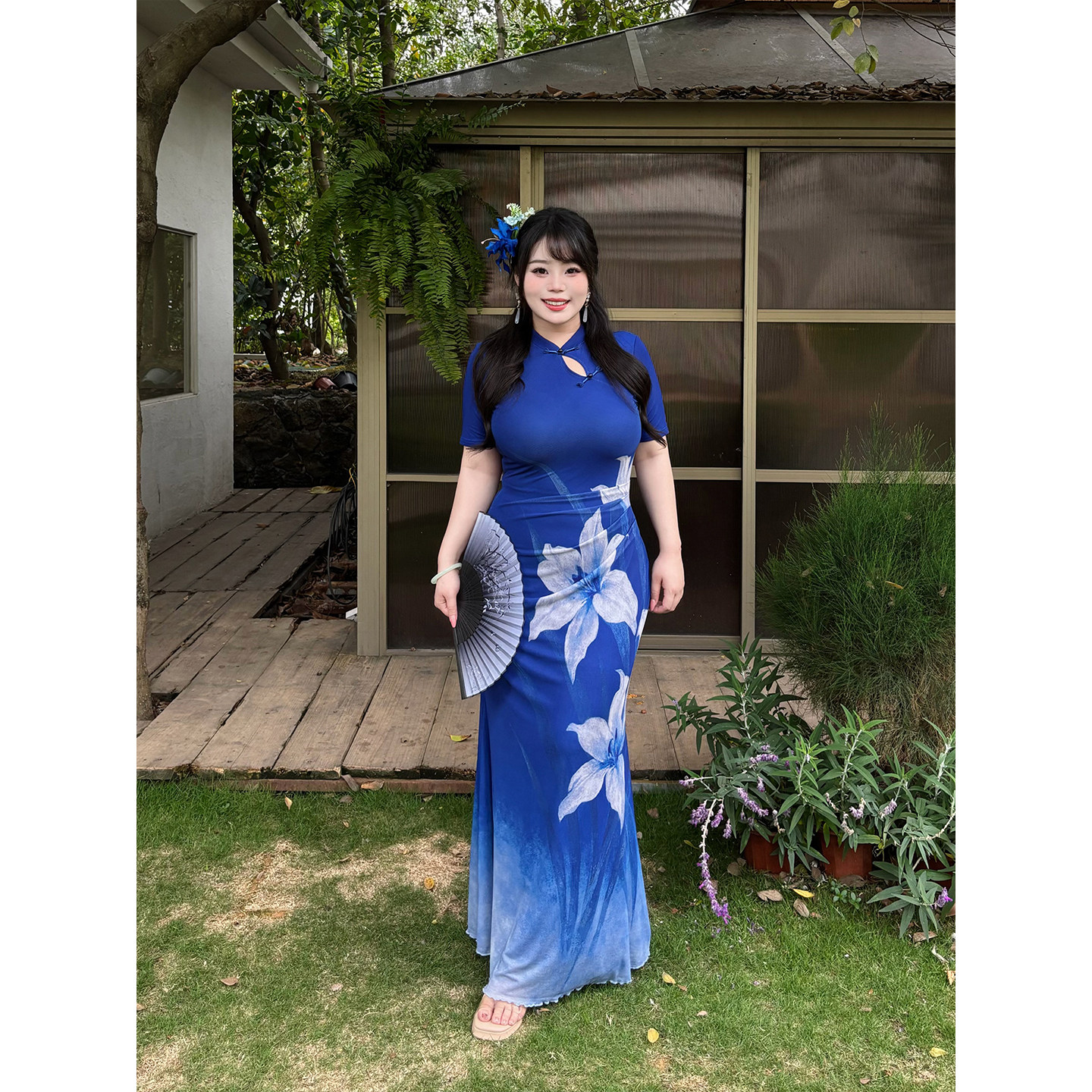 Babes【水色兰香】大码新中式温婉气质国风蓝色修身显瘦旗袍长裙