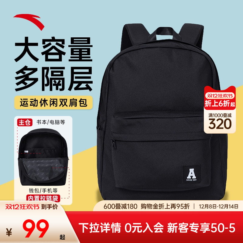 安踏背包学生书包新款男女休闲中学生经典帆布运动背包旅行双肩包