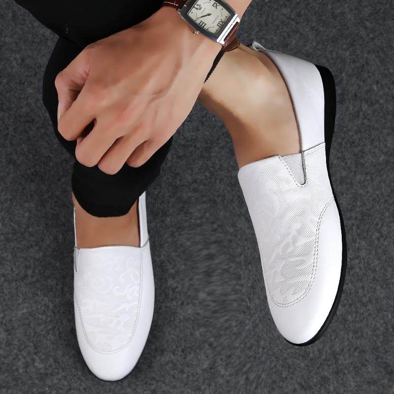 高档春季白色休闲 皮鞋男真小皮软底豆鞋头层牛皮社印花会伙 伙韩