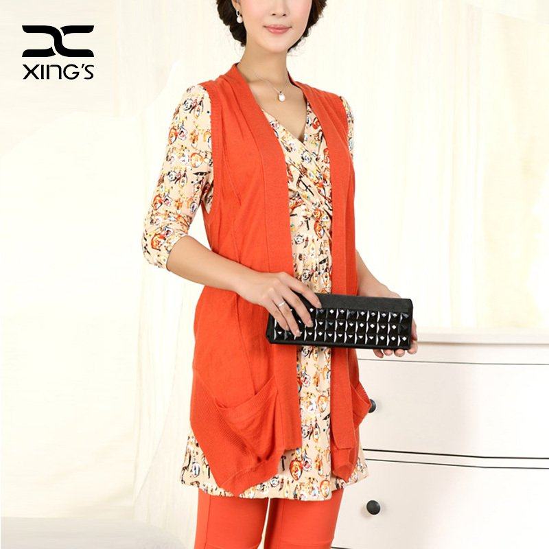 邢氏女装春秋新款针织衫大码宽松外套女橘色开衫中长款针织马甲女