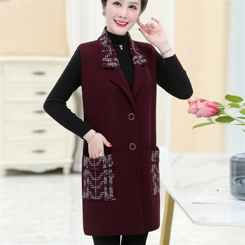 速发洋气冬妈装肩妈中长款针织马甲开衫中老年时尚坎秋马夹大码外