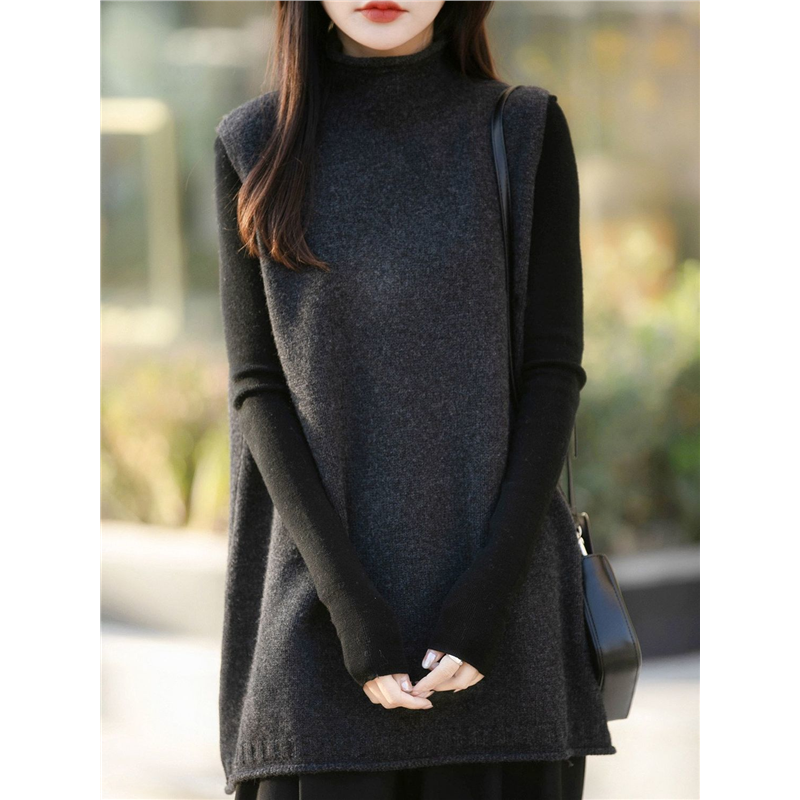 法式慵懒风半高领叠穿加厚针织马甲女秋冬保暖无袖中长款毛衣坎肩
