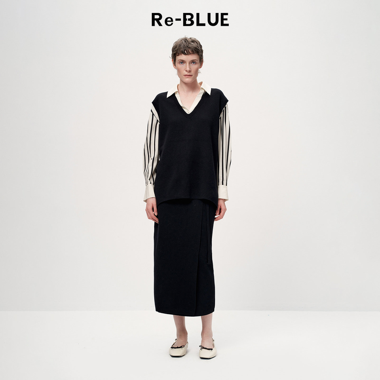 Re-BLUE轻奢优雅女装极简百搭绵羊毛混纺V领中长款针织马甲
