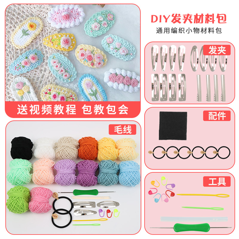 发夹diy材料包初学者钩针编织女孩发饰勾线手工发卡毛线夹子配件
