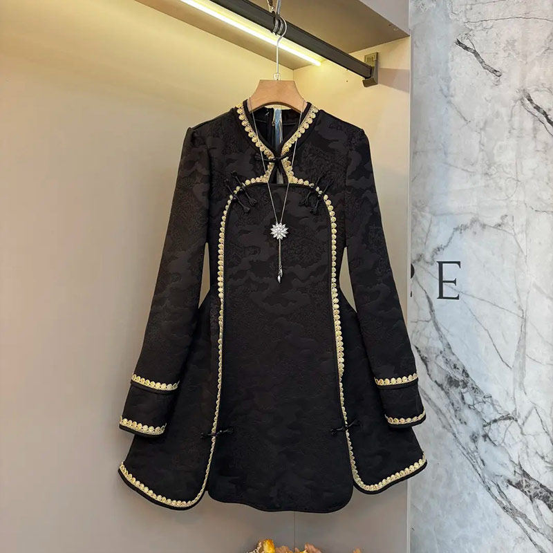 加肥大码女装中长款复古风时尚长袖显瘦胖妹妹宽松盘扣烫钻连衣裙