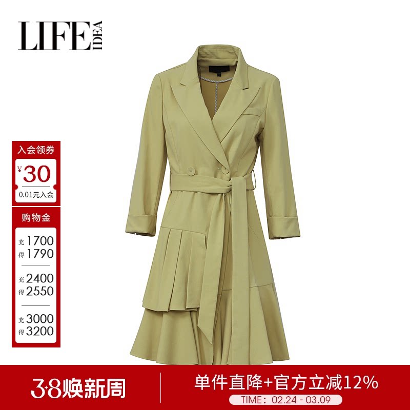 莱芙艾迪儿女装设计感新款时尚黄绿色摩登不规则裙摆中长袖连衣裙