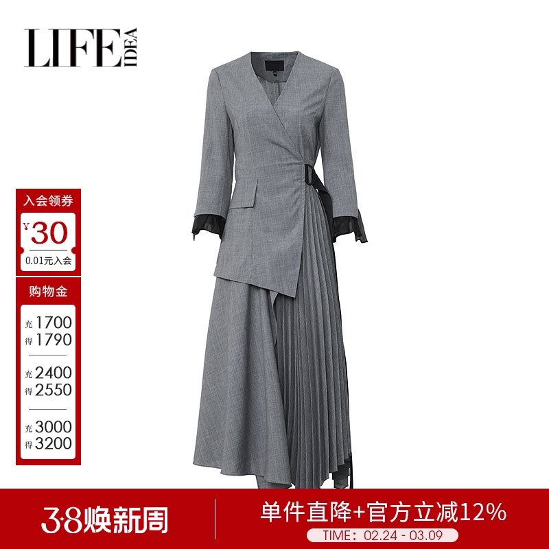 莱芙艾迪儿女装时尚新款灰色长裙女V型领不对称排褶中长袖连衣裙