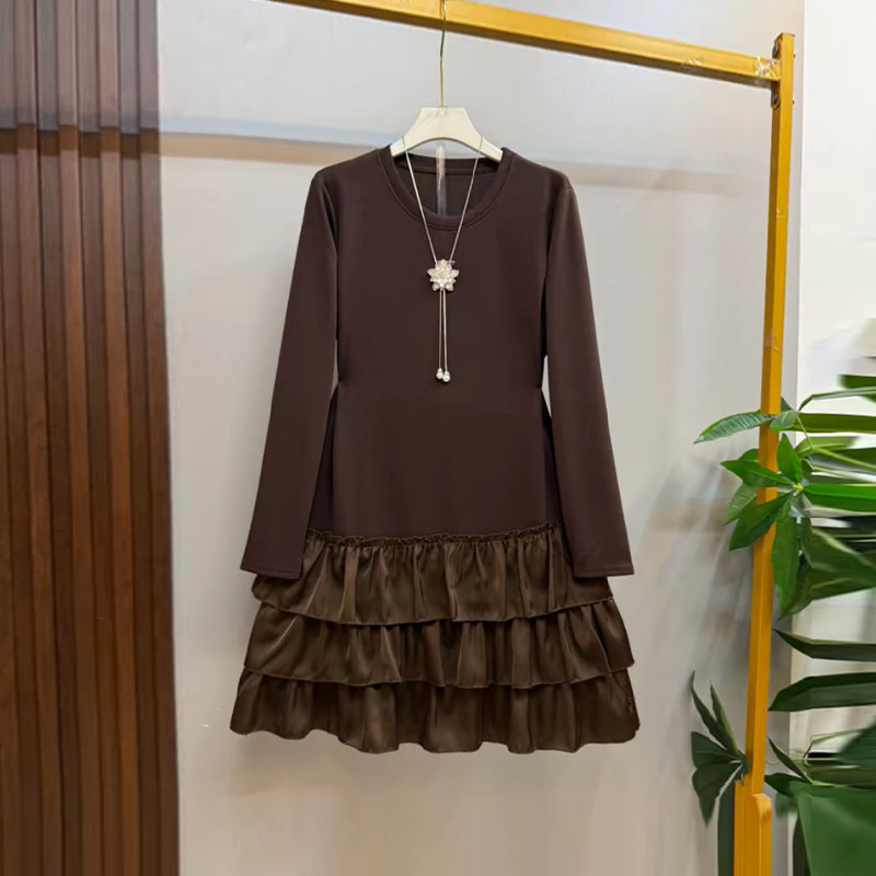 加肥圆领拼接荷叶边长袖中长款连衣裙大码女装气质轻熟风显瘦裙子