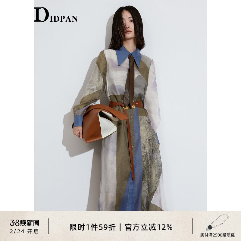 IDPAN女装商场同款时尚艺术印花X型廓形荷叶边下摆中长袖连衣裙女